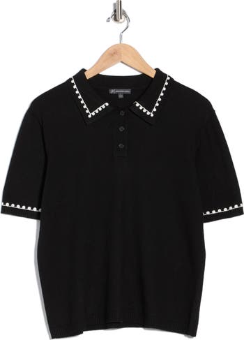 A contrasting dotted trim adds a lovely touch to this cozy sweater finished with a charming collar and short sleeves.