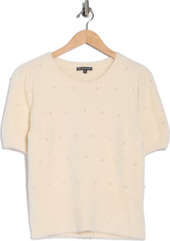 Refresh your work day essentials or polish up your weekend ensembles with this fuzzy crewneck sweater detailed with lustrous faux pearl and framed with puff shoulders.