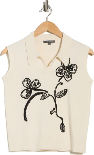 Floral embroidery brings instant charm to this sleeveless polo-sweater knit from soft, lightweight yarns in a cropped silhouette.