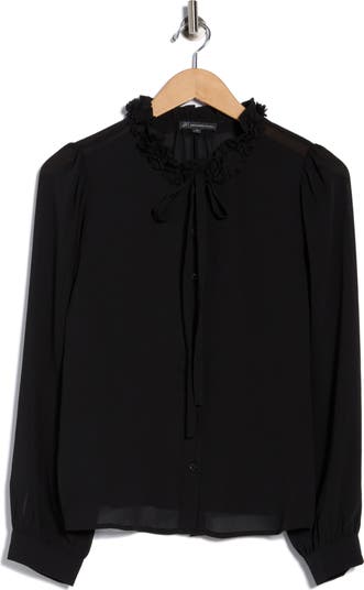 Dimensional floral appliqués and a dainty tie accentuate the neckline of this relaxed-fit button-up shirt cut from lightweight semisheer fabric.