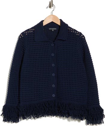 Dainty open stitches enhance the breathable comfort of this soft cotton-blend cardigan framed by a spread collar and shaggy fringe trim.