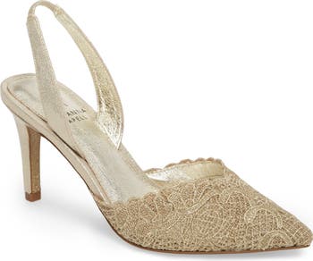 Pretty crocheted lace freshens the look of a pointy-toe slingback styled with a V-notched topline.