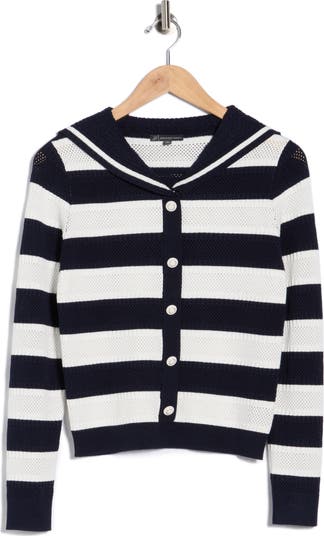 A shawl collar and wide stripes detail a charming cardigan sweater with a nautical-inspired appeal.