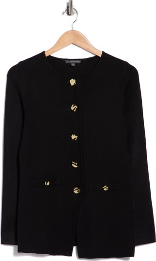 Polish your workday look with this solid cardigan framed by molten buttons and a notched hem.