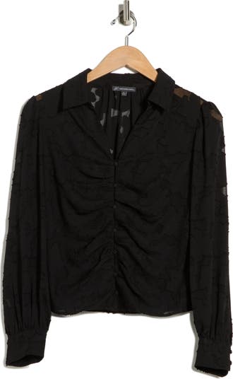 Perfect for your next coffee or brunch date, this button-up shirt is covered with burnout flowers and shaped with center ruching.