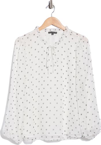 Semisheer fabric brings alluring detail to a blousy woven top framed by a tied neckline edged in frilly ruffles.