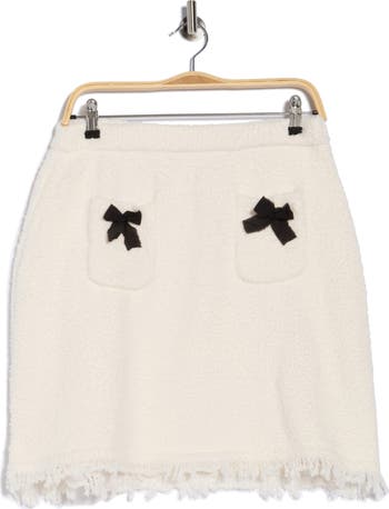 Refresh your weekend wardrobe with this textured-knit skirt detailed with frayed black bows on the patch pockets.
