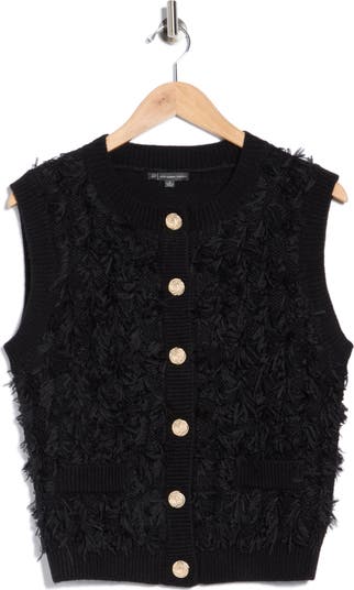 Fringed yarns texture this perfectly polished sweater-vest framed by gleaming buttons and ribbed trim.