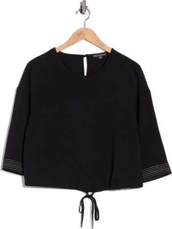 Drop shoulders and a drawstring waist lend effortless ease to this three-quarter sleeve top accented with contrast stitching.