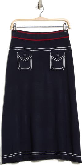 Contrast top stitching outlines the front patch pockets of this A-line skirt knit from soft yarns.