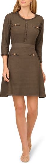 Tailored in textured waffle knit with gleaming button accents, this three-quarter sleeve mini offers a modern take on Parisian style.