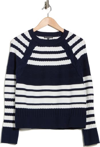 Ribbed hems and wide stripes detail a cozy pullover sweater with a wavy rib texture to boost the nautical-inspired appeal.