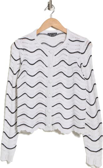 Airy pointelle stitches in a zigzag pattern define this cardigan finished with scalloped trim for a look that shines on its own or layered.