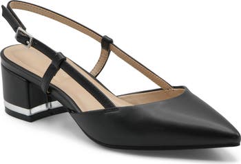 A pointy toe and block heel balance a sleek pump fashioned with a slingback strap for a secure fit.