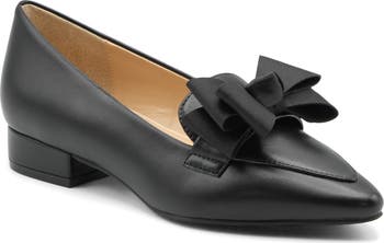 A grosgrain ribbon bow brings the drama to this soft faux-leather pump framed by a pointed apron toe and low block heel.