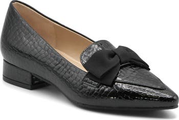 A grosgrain ribbon defines the pointed toe of a sleek pump fashioned from glossy snake-embossed faux leather for a polished work-to-weekend style.