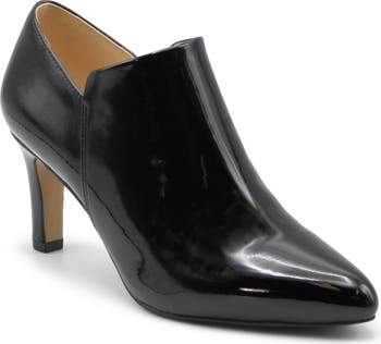 A shiny finish amplifies the polished style of this pointed-toe bootie fashioned with an easy side-zip closure and wrapped stiletto heel.