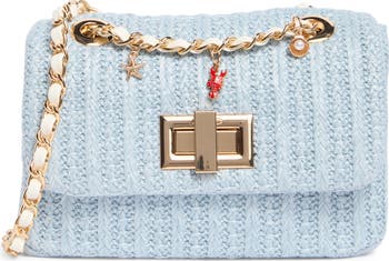 Gleaming hardware and beachy charms frame this faux-raffia bag fashioned with secure foldover-flap closure and dual interior compartments.