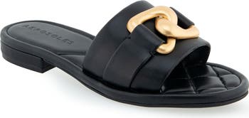 Gleaming hardware adds polished sophistication to a airy slide sandal fitted on a shock-absorbing sole.