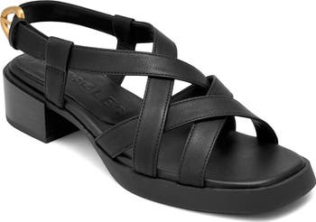 Ideal for everyday attire, this strappy faux-leather sandal is fitted with a cushioned insole and lofted by a block heel.