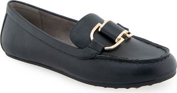 A gleaming buckle stands out at the vamp of a stylish loafer set on a cushioned footbed for lasting comfort.