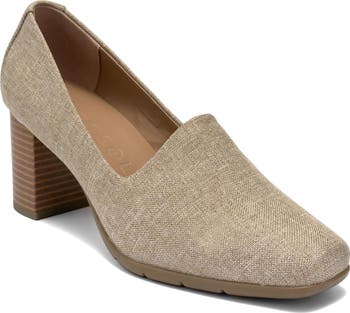 A square-tipped toe puts a retro finish on a woven loafer supported by a comfortably cushioned footbed and stacked block heel.