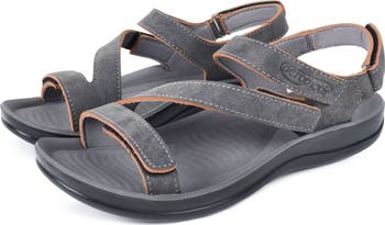 Enjoy the comfort of this soft faux-leather sandal featuring adjustable straps, a cushy, arch-supportive footbed and lightweight, shock-absorbing sole.