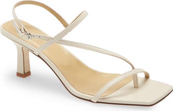Asymmetric straps and a sharp square toe bring modern appeal to this elegant sandal lifted by a slim yet sturdy heel.