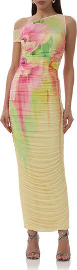 Fall for the unforgettable silhouette of this one-shoulder mesh maxi that's covered in a bold print and textured with rippled ruching down the sides to show off your curves.