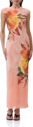 An eye-catching print enlivens this mesh maxi dress framed by cap sleeves and cut with a curve-hugging fit that's perfect for a night-out look.