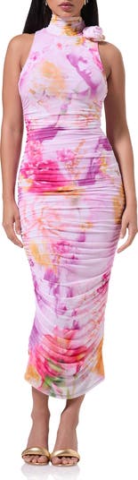 A ruched silhouette and an oversized rosette at the neckline bring all the drama to a sleeveless body-con dress decorated with a colorful floral pattern.