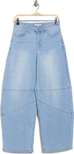 Show off cool retro style in these paneled barrel-leg jeans cut from cotton-blend denim in a perfectly faded wash.