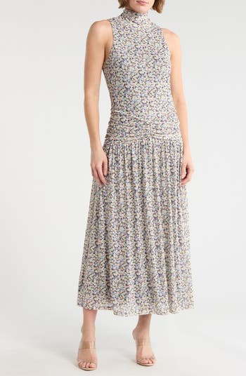 A garden of ditsy flowers blooms upon this sleeveless dress softly shaped at the waist with gentle ruching.