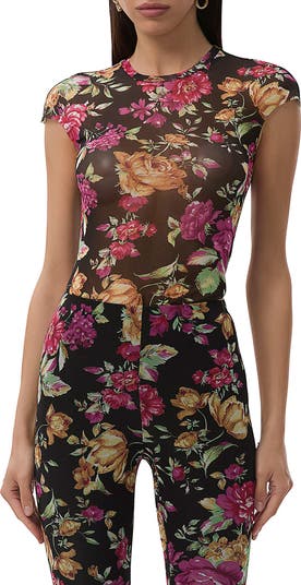 A vibrant print enlivens this close-fitting cap-sleeve top cut from gauzy, semisheer mesh.