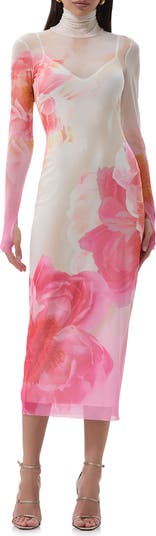 This gauzy mesh dress with a scrunched turtleneck, thumbhole cuffs and a smooth, curve-hugging silhouette makes a bold impression on your next night out.