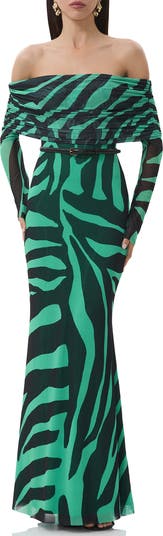 Thelma Print Off the Shoulder Long Sleeve Mesh Maxi Dress