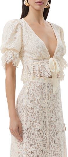 Charm your audience on date-night in this lace babydoll top framed by puffy sleeves and secured by an elegant front tie.