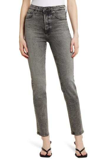 A slim cut modernizes the look of these straight-leg jeans that have a beautiful gray wash and high rise.