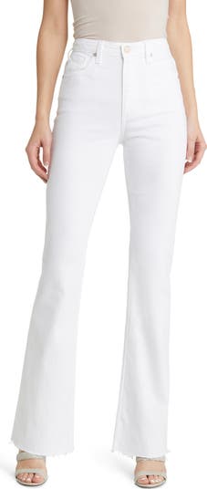 A superhigh waist and full-length legs create a stunning silhouette in these raw-hem bootcut jeans crafted from bright-white Japanese stretch denim.
