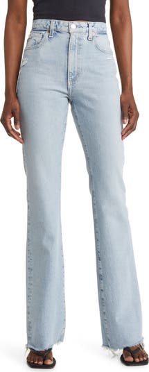 Rock casual-chic style in these full-length, raw-hem bootcut jeans made from premium Japanese stretch denim in a sunny light wash.