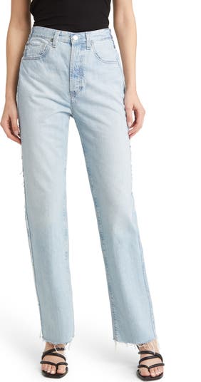 Fraying edges bring DIY vibes to these high-waist jeans cut from nonstretch denim in a relaxed straight-leg silhouette.