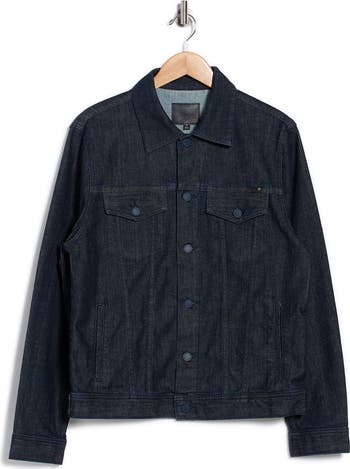 Elevate your off-duty ensembles with this trucker jacket cut from dark-washed stretch denim and finished with handy pockets.
