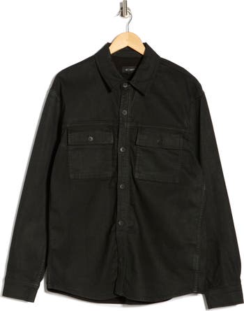 A rugged shirt-jacket gets a night-out-worthy remix in lightweight, coated stretch denim that creates a leather-like look.