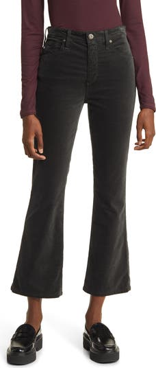 Add plush softness and texture to your look with stretch-velvet five-pocket pants flaunting a figure-hugging high waist and cropped bootcut legs.