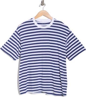 Dropped shoulders bring a slouchy fit to this boxy-fit crewneck T-shirt encircled in timeless stripes.