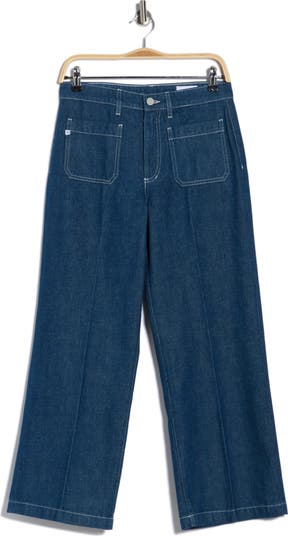 Outlined stitching brings definition to the minimalist styling of these high‑waisted jeans with an ankle‑grazing wide leg.