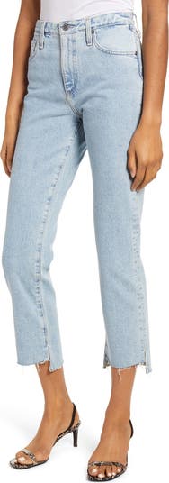 These sleek and cropped straight-leg jeans made from Japanese stretch denim are distressed with fraying step hems.