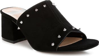 Polished studs bring an edgy flourish to this sleek square-toe mule lifted by a wrapped block heel.