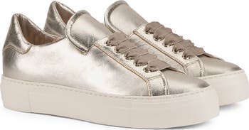 A metallic finish styles an Italian-made leather sneaker, furnished with a cushioned insole and lifted by a chunky platform cupsole. An elastic anchored tongue makes it easy to slip-on and off this versatile style.
