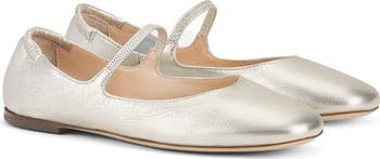 An elasticized mary jane strap offers retro styling and a secure fit on a metallic leather flat grounded by a cushioned footbed for comfortable wear.